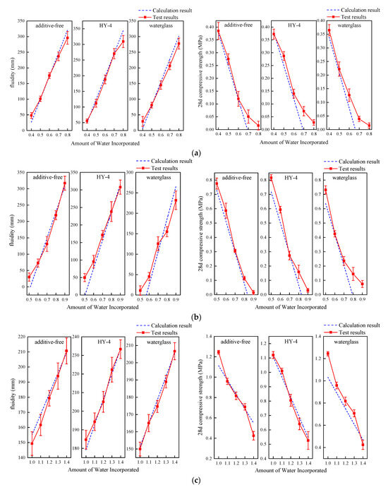 In the lake mud-cement grout system, although there is some deviation between the model and the measured values, the overall trend is consistent. The prediction is most accurate when 5% sodium silicate is added. However, slight deviations are observed in the samples with no additives and those with 5% HY-4. It is noteworthy that at high water content, the model’s prediction for compressive strength is lower than the actual measurement, which warrants further attention.
