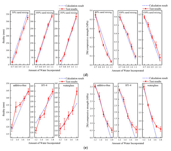 In the clay-cement-based grout (low cement content) system, the model predicts flowability quite accurately, especially at low water content, where the fit is significant. However, when the water amount increases to 0.8, the model’s prediction is slightly lower than the actual measurement, although the overall trend remains consistent. Regarding compressive strength, the model’s prediction shows some deviation at high water content, with experimental results indicating that some samples still retain a certain strength, suggesting limitations in the model within this range.