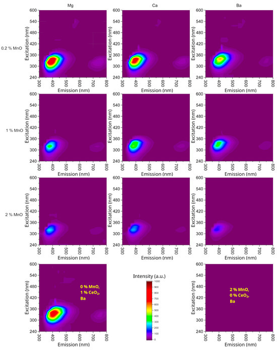 Figure 1 presents the results of the excitation–emission mapping, which illustrates the luminescence of the prepared samples. The excitation wavelength was varied with a step of 20 nm in the range of 240–600 nm, whereas the emission spectra were measured in the wavelength range of 300–800 nm with a step of 1 nm. In the spectra, the excitation wavelength is plotted on the vertical axis, the corresponding emission wavelength is plotted on the horizontal axis, and the third dimension of the figure represents the intensity of the measured emission, which is expressed using a color scale. The individual rows display the changes in the spectra caused by the alkaline-earth metal, whereas the columns show the effect of increasing the manganese content.