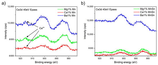 XPS analysis was used as the baseline method for determining the oxidation states of mainly the cerium and manganese. In general, it can also be applied to simpler oxide glasses to detect the ratio of bridged to non-bridged oxides, providing insights into the interconnectedness of the glass network. In our experiment, we analyzed two sets of glass triplets (Mg, Ca, and Ba): one containing 1 mol.% MnO (labeled Me1%Mn) and another with the same Mn concentration but with the addition of SnO (labeled Me1%MnSn). Figure 2 shows a comparison of the bands in the energy region of 875–920 eV of Ce3d, primarily reflecting the oxidation states of cerium. The band at 916 eV is attributed exclusively to Ce4+ [13], whereas the other two visible bands consist of multiple peaks corresponding to both Ce3+ and Ce4+, along with overlapping Mn LMM and Ba MNN Auger peaks. A comparison of Figure 2a,b reveals that SnO-containing glasses had a lower intensity band at 915 eV (in the case of the glass with Ba, the band is undetectable), which confirms the reduction of Ce4+ to Ce3+.