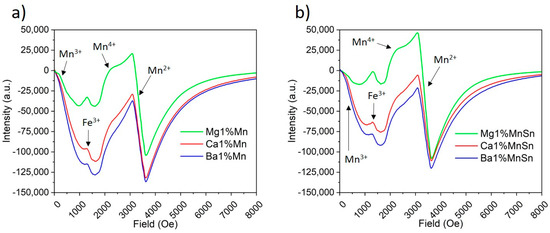 There was another resonance line detectable below 1000 G (Figure 3), which was likely produced by Mn3+. Logically, when Mn2+ and Mn4+ are present, there should be a non-zero probability of Mn3+ existing as well unless specific and charge compensation is introduced (which is not the case in this work). Since Mn3+ is a non-Kramers ion, one may expect large fine splitting, resulting in the spectral localization of the line below 1000 G at the X-band (see the Experimental section). Its intensity was approximately the same in the Ca- and Ba-based glasses, whereas it was about 3–4 times weaker in the Mg-containing glass, regardless of whether Sn was present or not. This can be explained by the fact that Mg has the smallest ionic radius among the three samples (Mg (approximately 0.6 Å on average when considering all possible oxygen coordination numbers) vs. Ca (about 1 Å) and Ba (ca 1.5 Å)). The average ionic radius of Mn is slightly below 0.6 Å. The values of the radii were obtained from [49]. Given that glass is a less rigid system than a single crystal, the size of the replacing ion can be expected to play a significant role in effective substitution.