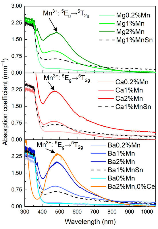 Figure 4 illustrates the impact of increasing the manganese content on the shape of the absorption spectra. Simultaneously, it demonstrates how different types of alkaline-earth metals influence the spectra. The Ce and Mn reference glasses are shown for the Ba-containing glass. It is evident from the figure that the Ba–Ce reference glass doped only with Ce exhibited no significant absorption in the UV–VIS region except for the absorption edge. In the spectra of the Ba–Mn reference glasses, the peak around 480 nm, attributed to the 5Eg → 5T2g transition of the Mn3+ ion, is clearly visible, confirming the partial presence of Mn3+ in the glass. The intensity of the Mn3+ band increased with the Mn concentration. Its asymmetry is probably associated with the Jahn–Teller effect and lower site symmetry [24,33].