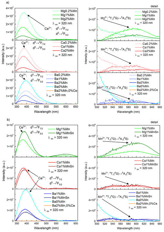 The luminescence spectra of the Ce- and Mn-doped glasses: (a) the influence of the alkaline-earth metal (in the column) and the influence of the MnO content (the individual parts of the figure); (b) the influence of the SnO content.