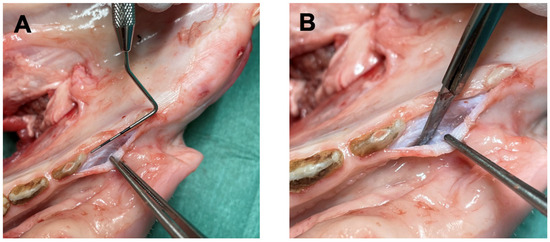 Ethical approval was not required for this ex vivo study. The study was performed according to the CRIS Guidelines [34]. Forty fresh pig mandibles were acquired from the local slaughterhouse. A mid-crestal mucoperiosteal incision was performed bilaterally in the edentulous region between the canine and the first premolar to create a soft tissue defect on each side of the mandibles. The horizontal incision was extended to a sulcular incision of canine and first premolar. A partial thickness flap of 15 mm in length was raised without vertical incisions to remain minimally invasive (Figure 1). To ascertain standardization, one dentist (MS) practised the preparation procedure several times before creating identical defects/flaps for the study.