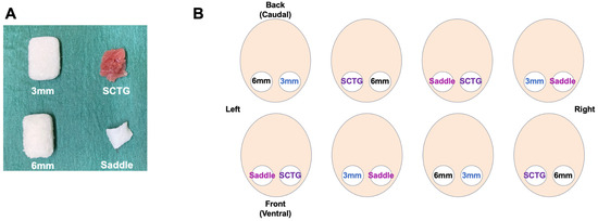 Five unbiased, experienced dentists performed the surgical procedures. For each dentist, an assistant was assigned to record time for graft shaping, and for placement and suturing, as well as to ensure the accuracy in proceedings. Each dentist/assistant team obtained a 6-well plate with four samples of each STS prototype (Geistlich Fibro-Gide® (GFG or VCMX), Geistlich Pharma AG, Wolhusen, Switzerland): a 12 × 20 × 6 mm block (6 mm GFG), a 12 × 20 × 3 mm block (3 mm GFG), and a pre-customized “saddle-shape” (saddle GFG) with a thickness of 2.5 mm in the central area, gradually decreasing to the edges up to 0.5 mm and a length of 10 mm. The saddle GFG was digitally designed based on average single-tooth posterior defect identified in our previous study [32]. Only 20 saddle-shape prototypes could be produced, which limited the number of each prototype to 20 samples per group. These three STS groups were compared to the gold standard, the subepithelial connective tissue graft (SCTG), the size of 14 mm length, 10–12 mm width, and 2–3 mm thickness harvested from other regions of the pig jaw (Figure 2A). The defect positions were randomized, with the order of treatment options varying from one dentist to another (Figure 2B).