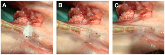 Photographs showing placement, suturing and closure of one STS graft. (A) Insertion of the graft using one apically placed suture to stabilize the graft’s position. (B) Final position of the graft at the site. (C) Tensionless primary flap closure with three single-knot sutures.