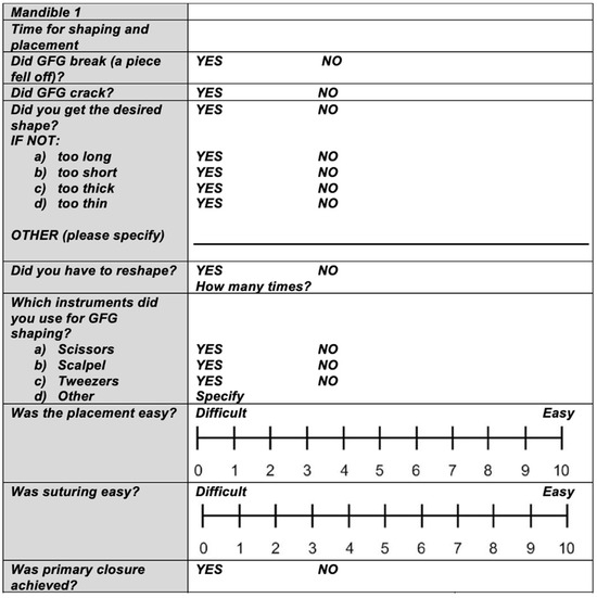 A recording sheet with specific questions was developed to document the surgical procedure (Figure 4). Primary outcome included time for STS shaping and time for placement. Secondary outcomes included the cracking/breaking of the STS; the necessity for reshaping and the type of instruments used were noted. A total of 16 sheets were completed per dentist. Additionally, the surgeons were asked to rank their preferences regarding the grafts’ handling from the easiest to the most difficult and provide their reasoning.
