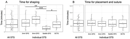 Graphical presentation of the analysis of times recorded by the dentist s. (A) Evaluation of the “time for shaping” and (B) “time for placement and suturing” for the four treatment grafts. Medians and confidence intervals are shown. Each graft was used 20 times (4 grafts per dentist). Significant differences (p < 0.05) are indicated: * for p < 0.05, ** for p < 0.01 and *** for p < 0.001.
