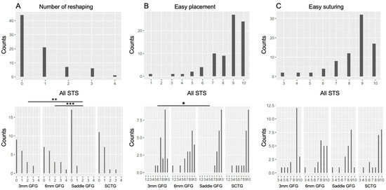 Graphical presentation of different STS handling parameters evaluated by the dentists. (A) Evaluation of the “number of reshaping times” and the VAS score (1 to 10 values) for (B) “easy placement”, and (C) “easy suturing”. Number of counts for the four treatment materials shown were calculated for the median with confidence intervals. n = 20. Significant differences (p < 0.05) are indicated: * for p < 0.05, ** for p < 0.01 and *** for p < 0.001.