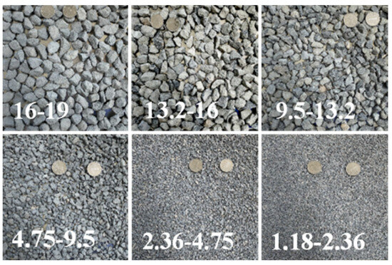 The crushed stone, manufactured sand, and limestone mineral powder were, respectively, selected as coarse aggregates, fine aggregates, and filler to perform the laboratory tests. Figure 1 depicts the selected aggregates. The properties of different-sized aggregates and filler were determined according to the Chinese specification “Test Methods of Aggregate for Highway Engineering (JTG E42-2005)” [29], which is listed in Table 1. It should be noted that the Los Angeles abrasion of coarse aggregates is able to meet the requirements of the Chinese specification “Technical Specification for Construction of Highway Asphalt Pavements (JTG F40-2004)” [30] according to the report provided by the manufacturer, so the Los Angeles abrasion’s range of the specification requirements (≤28%) is only presented in Table 1.