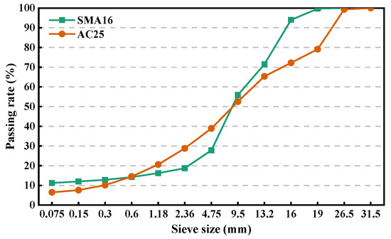 Traditional asphalt mixture gradation design is mainly based on the power function curve [6]. This method can achieve the densest packing and maximum density of aggregates, but it is unable to ensure the anti-rutting performance of asphalt mixtures. Several researchers attempted to conduct the design of aggregate blend by packing test and macroscopic volume parameters. The Bailey method concluded that the critical size of coarse aggregate and fine aggregate is 0.22 times of the nominal maximum aggregate size (NMAS) through the geometric packing model of spheres [7]. Weymouth [8] proposed particle interfering theory and developed the calculation method of aggregate gradation for cement concrete to improve workability. Kim et al. [9,10,11] proposed a dominant aggregate size range (DASR) model to evaluate the composition features of aggregate blends. The method suggested that the voids formed by DASR particles should be filled by small particles and asphalt mastics. Guarin [12] determined the voids between DASR particles based on particle packing theory and proposed an interference coefficient and interference particle size range. Miao et al. [13] defined the percentage of contribution to the packing volume (PCPV) index to quantify the packing function of particles in packed aggregate blend. They also analyzed the effect of particle size and morphology on packing characteristics of aggregates [14]. The results showed that the packing function of particles is decided by both particle size and the composition of particles with different sizes. In summary, the above research mainly conducts geometric model-based theoretical analysis, lacking attention to the laboratory performance of aggregate blends.