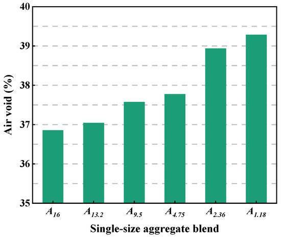 Figure 5 depicts the air voids of single-size aggregate blends. As can be seen, the air void is between 36% and 40% for the single-size aggregate blend. The particle size has a significant effect on the air void of the blend. The smaller the particle size, the larger the air void of the single-size aggregate blend. This is because the larger aggregates are minimally affected by the surface force and their position can be adjusted more easily on the vibration table compared with the smaller aggregates.