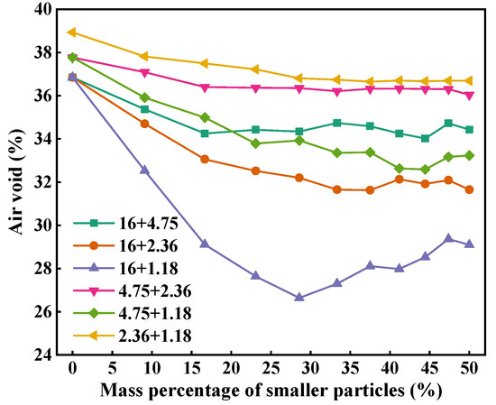 Figure 6 depicts the air voids of two-size aggregate blends. As can be seen, with the increase in the mass percentage of smaller particles, the air voids of all two-size aggregate blends gradually decrease first and then keep stable, except 16 + 1.18. The air voids of 16 + 1.18 blends decrease first and then gradually increase with increase in 1.18 mm particles. Therefore, the addition of smaller particles in larger particles can reduce the air void of the blend. The air void of 16 + 4.75 is larger than that of 16 + 2.36 and 16 + 1.18, and the air void of 4.75 + 2.36 is greater than that of 4.75 + 1.18 at the same mass percentage of smaller particles. This indicates that particle size ratio has a significant effect on the packing characteristics of the blend. The larger the size ratio, the greater the air void of the blend at the same mass percentage of smaller particles and the faster the decrease in the air void with the increase in the mass percentage of smaller particles. In addition, the air voids of 16 + 4.75, 4.75 + 2.36, and 2.36 + 1.18 follow the order of 2.36 + 1.18 > 4.75 + 2.36 > 16 + 4.75, indicating that the particle size also has a significant effect on the air void of the blend. The smaller the particle size, the larger the air void of the blend.