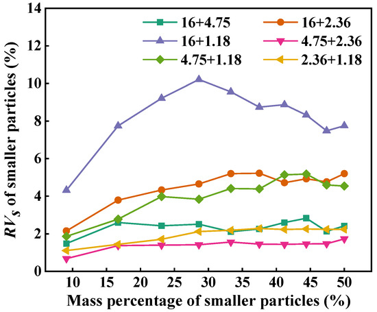 Figure 8 depicts the RVs of smaller particles in two-size aggregate blends. As can be seen, the RVs of the smaller particles shows an increasing trend with the increase in the mass percentage. The RVs of the smaller particles is greater than 0, indicating that the addition of smaller-sized particles in larger-sized particles can reduce the air voids of the blend. The RVs of the smaller particles in 16 + 1.18 is larger than that in 16 + 2.36 and 16 + 4.75 at the same mass percentage, which indicates that, the larger the particle size ratio, the greater the air void filling contribution of smaller-sized particles in two-size blends, and the smaller the particle size ratio, the weaker the air void filling contribution of smaller-sized particles.
