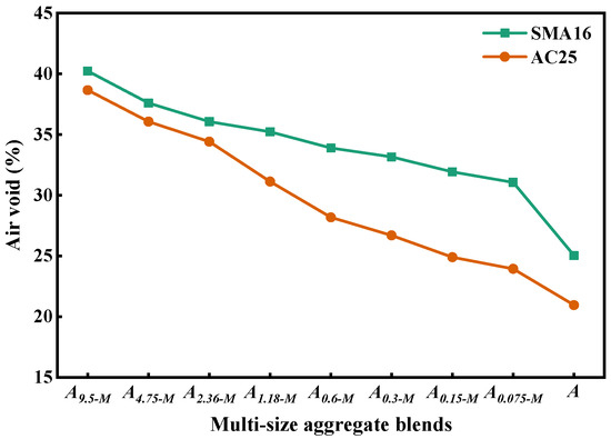 Figure 9 depicts the air void of multi-size aggregate blend. It can be seen that the air void of A(s+1)-M gradually decreases with the addition of s mm particles in it, indicating that the dense degree of the blend becomes better and the density of aggregate blend gradually increases. The designed As-M according to SMA16 has larger air void than that according to AC25, which indicates that the composition ratio of particles with different sizes has a significant effect on the air void of the blend.