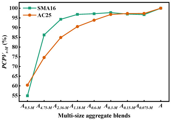 Figure 10 shows the contribution of As-M to the packing volume of A. As can be seen, the change in PCPVs-M can be divided into two stages: increasing stages and steady stages. For the designed multi-size blends according to SMA16, the PCPVs-M will not change when gradually adding the particles with a size smaller than 1.18 mm into As-M. For the designed multi-size blends according to AC25, the PCPVs-M will not change when gradually adding the particles with a size smaller than 0.3 mm into As-M. This indicates that particles smaller than 1.18 mm fully fill the voids in SMA16 and thosesmaller than 0.3 mm fully fill the voids in AC25. The PCPVs-M in SMA-16 grows faster than that in AC25, indicating that the composition ratio of particles with different sizes has an effect on the PCPV of the blend. Moreover, the fillers mainly provide better adhesive behavior between aggregates and asphalt binders.