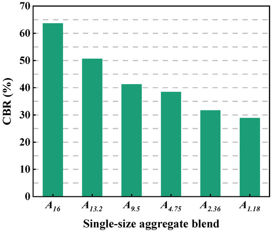Figure 12 depicts the CBR of the single-size aggregate blend. As shown in Figure 9, the particle size has an obvious influence on the values of CBR. The larger the particle size, the higher the values of CBR, indicting that larger particles have better bearing capacity and mechanical performance.