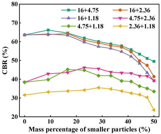 Figure 13 describes the CBR value of two-size aggregate blend. As can be seen, with the increase in the mass percentage of smaller particles, the CBR value of the blend slightly increases first and then gradually decreases. This indicates that the mechanical performance and bearing capacity of the blend can be improved by properly increasing the smaller particles in larger particles. For the 16 + 1.18 and 16 + 2.36 blends, the CBR values are largest when the mass percentage of the smaller particles is 16.7%. For the 16 + 1.18, 16 + 2.36, and 16 + 4.75 blends, the CBR values decrease significantly when the mass percentage of smaller particles is more than 30%. This is because excessive smaller particles destroy the skeleton structure of larger particles, resulting in the reduction in the bearing capacity of the blend. In general, at the same mass percentage of smaller particles, the CBR values of 16 + 4.75, 16 + 2.36, and 16 + 1.18 blends follow the order of 16 + 4.75 > 16 + 2.36 > 16 + 1.18 and that of 4.75 + 2.36 is larger than that of 4.75 + 1.18. This indicates that size ratio has a significant effect on the mechanical performance of the blends and, the larger the particle size ratio, the weaker the load bearing capacity. The CBR value of 16 + 4.75 is greater than that of 4.75 + 2.36 and that of 2.36 + 1.18 is smallest, indicating that the blends composed of larger particles have better load bearing capacity than those composed of smaller particles.