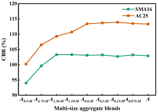 Figure 14 depicts the CBR value of the multi-size aggregate blend. It can be seen that the CBR values of the blends increase first and then keep stable with the addition of smaller particles. This indicates that the addition of smaller particles can improve the bearing capacity of mixtures and reduce the crushing of aggregates, which contributes to enhance the stability of asphalt mixtures. For the designed multi-size blends according to SMA16, the CBR will not change when adding particles with a size smaller than 1.18 mm into As-M. For the designed multi-size blends according to AC25, the CBR will not change when adding particles with a size smaller than 0.3 mm into As-M. The above results indicate that the particles smaller than 1.18 mm in SMA16 and those smaller than 0.3 mm in AC25 mainly play a role to fill the voids and have little contribution to the load bearing. The designed blends according to AC25 have a larger CBR compared with that according to SMA16, indicating that the load bearing capacity of AC25 is better than that of SMA16.