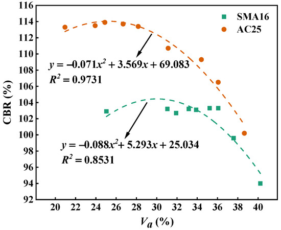 Figure 15 describes the relationship between the air void and CBR for the single-size aggregate blend. It can be seen that, for the single-size aggregate blend, the larger the air void, the smaller the CBR value, and the air void and CBR shows a significant quadratic relationship. Therefore, the air void of the blend has an effect on the mechanical performance.