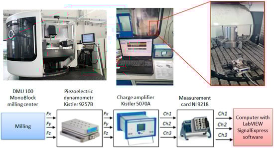 The cutting forces were measured using a piezoelectric force sensor, Kistler 9257B (Winterthur, Switzerland), with a measurement range of ±5 kN, mounted on the machine table (Figure 1). The signal from the sensor is transmitted to a charge amplifier and sent to a computer via a USB connection using a 16-bit analog-to-digital converter with a measurement range of ±10 V. Signal visualization, processing, and recording were performed using a program developed in the LabVIEW environment. The sampling frequency was set to 20 kHz.