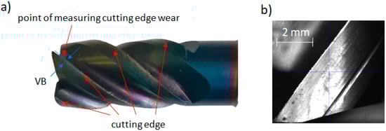 Tool wear was measured using a DinoLight AM7915MZT microscope (Torrance, CA, USA) combined with a Zoller Genius measuring device (Ann Arbor, MI, USA). The parameter used to evaluate tool wear was the flank wear width VB (mm), which is commonly used to estimate the cutting capability of the tool [36,37]. The method for determining VB and a sample microscopic image are shown in Figure 2.
