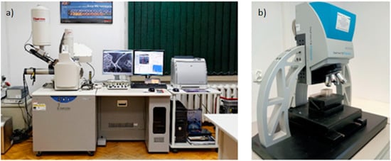 (a) Scanning Electron Microscope S-3400N HITACHI (SEM) used for microstructure analysis and (b) Alicona Infinite Focus G4 microscope for surface topography and roughness evaluation.