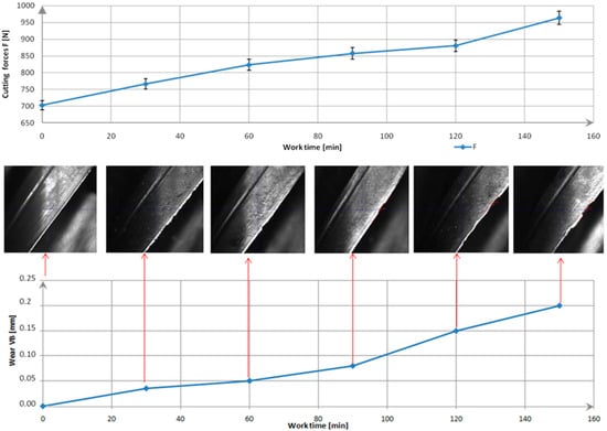 In the first phase (0 min) of this study, the tool was new. The total cutting force F was about 700 N. After 30 min of operation, the first signs of microscopic wear (abrasive wear) appeared. Minor damage and material adhesion were visible on the coating. Wear began, but its impact on the cutting force was still negligible. Clear signs of wear on the edge were observed after 90 min. The total cutting force increased by about 22% from the start of the tests. Advanced wear of the cutting edge was evident after 120 min. Numerous chippings and traces of adhered material (adhesive wear) were visible. The flank wear VB reached approximately 0.15 mm, and the total cutting force increased to around 885 N. A VB of 0.2 mm was achieved after 150 min, with the total cutting force reaching 972 N (Figure 4). A typical progression of tool wear was observed throughout the tool’s life cycle: initially small changes, followed by accelerated wear and eventually critical damage. These phenomena were also observed and described in the literature, where similar tool wear patterns were reported [37,38]. The study was repeated for five tools manufactured within the same production batch. No significant differences were observed. The values of the cutting force components and the condition of the cutting edges were comparable, falling within a 5% measurement uncertainty.