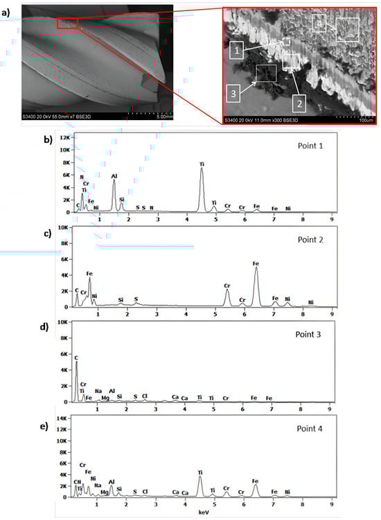 The chemical composition analysis of the coating and the generated build-up after machining 316L stainless steel is shown in Figure 5. At point 1, the presence of nitrogen (N), silicon (Si), and metals such as chromium (Cr), aluminum (Al), and titanium (Ti) was confirmed, which are components of the multilayer coating nACo3 (Figure 5b). In the analysis of the generated build-up (point 2), the presence of elements like carbon (C), silicon (Si), sulfur (S), chromium (Cr), nickel (Ni), and iron (Fe) was confirmed, indicating the presence of the workpiece material 316L stainless steel (Figure 5c). Locally, a dark build-up (point 3) was observed, which may indicate overheating due to high cutting temperatures (Figure 5d). At point 4, traces of adhered material were observed on the coating surface (Figure 5e).