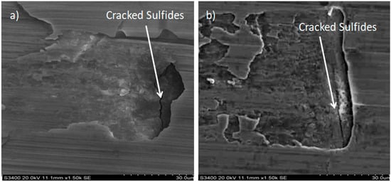 SEM images showing cracked sulfides on the machined 316L stainless steel surface: (a) after 30 min and (b) after 60 min of machining.