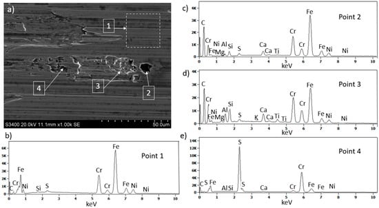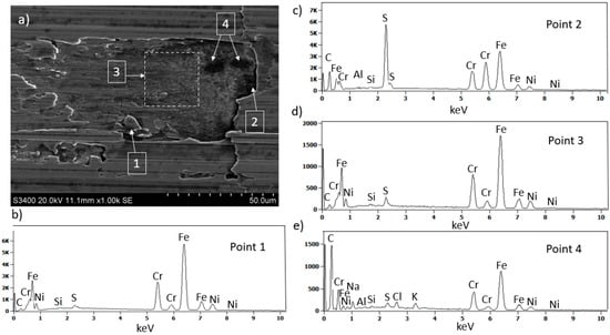 SEM surface observations of 316L stainless steel after machining (Figure 7a), combined with EDS microanalysis, showed that as a result of tool contact with the machined surface, chip adhesion occurs (point 1 Figure 7a,b). Moreover, due to tool contact with hard sulfides (point 2 Figure 7a,c), surface damage occurs, and sulfur is drawn onto the damaged steel surface (area 3 Figure 7a,d). On the damaged surface of 316L stainless steel near the sulfides, black “spots” were also observed (point 4 Figure 7a,e). Black areas on the machined material surface may indicate local burn marks.