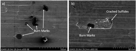 Observations of 316L stainless steel at the initial stage (Figure 8a) and after 30 min of machining revealed that the local accumulation of sulfides may contribute to burn marks (Figure 8a,b). Similar findings were observed on other surfaces of 316L stainless steel after longer tool operation times. The causes of burn marks on the machined surface of stainless steel could be