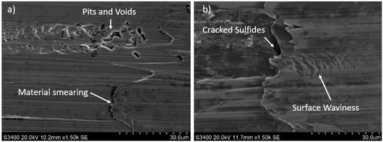 The machined material surface also exhibited small, irregular indentations, often near inclusions or material imperfections (Figure 10a), as well as waviness on the machined material surface.