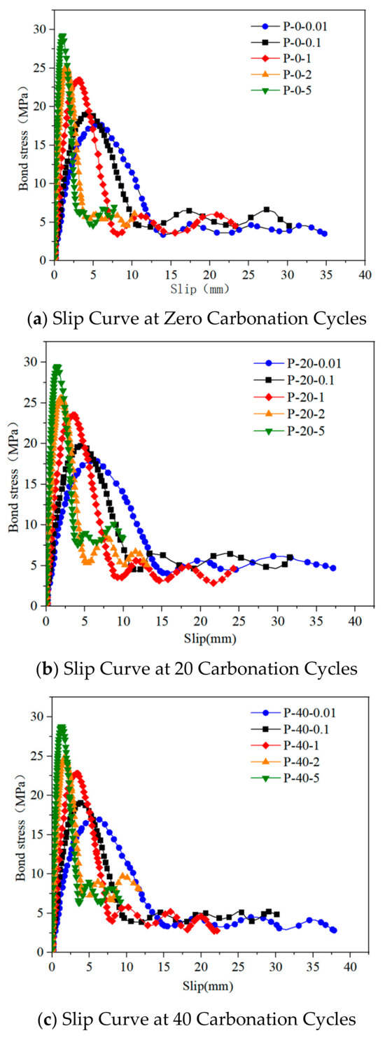 By comparing the bond-slip strength of reinforced reef limestone concrete under different carbonation cycles and loading rates, bond-strength curves are plotted for varying dry–wet carbonation conditions. This analysis considers the effects of carbonation cycles and loading rates on the bonding characteristics of the concrete while also examining the bond characteristics influenced by these two factors.