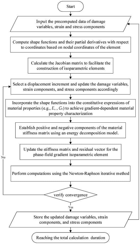 Specifically, to integrate the two energy decomposition models into the phase-field framework, the graded material properties are first computed based on the material parameters (e.g., E, , Gc) through Equations (15) and (16). These properties are subsequently applied to derive parameters (the bulk modulus K, and the Lame parameters λ, µ) in the energy decomposition models (Equations (21) and (22)), thereby enabling the determination of the positive and negative parts of C. Finally, the phase-field-displacement coupled finite element calculations are implemented through Equations (31)–(34) to complete the numerical formulation. At this point, the gradient properties are expressed in the element stiffness matrix expression. The numerical calculations of phase field gradient isoparametric elements are implemented through the UEL subroutine of the commercial software ABAQUS 2016. The Numerical implementation procedure of phase-field gradient isoparametric element is shown in Figure 2.