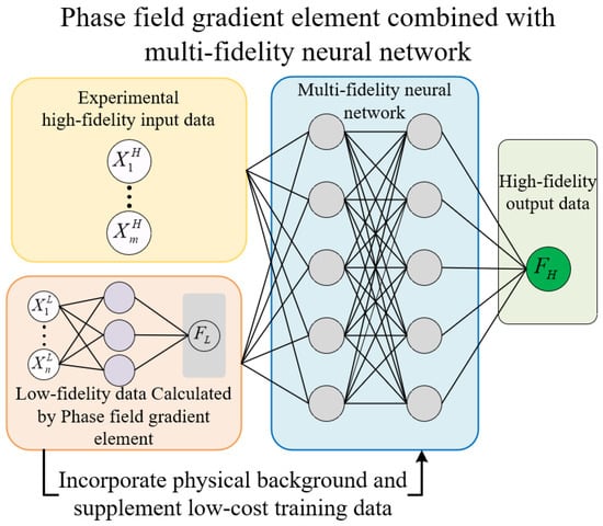 Multi-fidelity neural networks can effectively leverage “low-fidelity data” obtained through low-cost methods (such as numerical simulations and semi-empirical models) to investigate its correlation with “high-fidelity” experimental data, thereby optimizing the final output accuracy. The residual strength prediction method using this feature combined with the phase-field gradient finite element is shown in Figure 3.