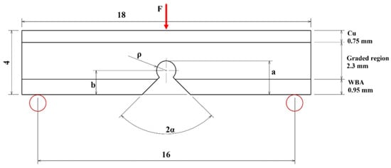 The validation data in this paper are sourced from literature [5], which documents a tungsten-copper functionally graded alloy fabricated using the powder metallurgy method, and nine different hole-drilled crack arrest configurations were tested. To verify the residual strength of the crack arrest with a hole, the literature adopts a three-point bending test as the evaluation method, which induces MODE I fracture. The material distribution and loading configuration are illustrated in the accompanying Figure 4, and the finite element model is shown in Figure 5.