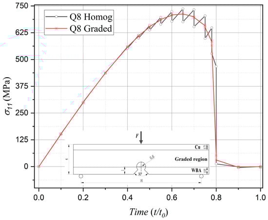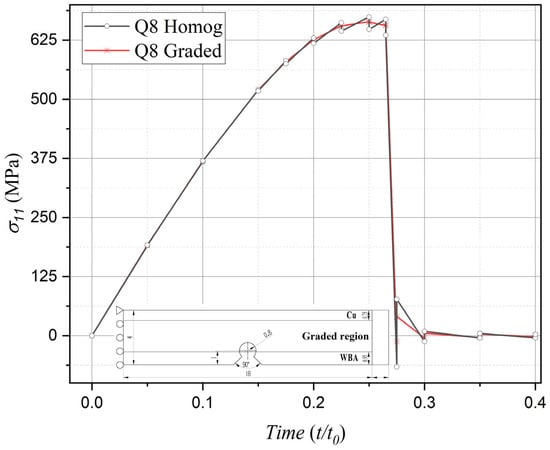 The comparative analysis specifically targets the interface nodes between two elements located along the vertical central axis, positioned closest to the notch root along the material gradient direction. The comparative results are illustrated in Figure 6, Figure 7, Figure 8 and Figure 9, where the horizontal axis represents the normalized computational time, expressed as t/t0, where t denotes the current simulation time instant and t0 = 1 indicates the total simulation duration. Specifically, regarding the horizontal stress component σ11 (the primary driving force for Mode I fracture) under Mode I loading, both element formulations exhibit stress evolution profiles characterized by an initial ascent followed by subsequent descent, which aligns with the physical progression of fracture damage. However, within the 0.4–0.8 temporal range, the homogeneous element solution demonstrates pronounced stress oscillations associated with stepwise discontinuities across element interfaces—a phenomenon conflicting with physical reality. Conversely, the graded element formulation substantially mitigates such oscillations, demonstrating superior numerical stability and enhanced solution accuracy.