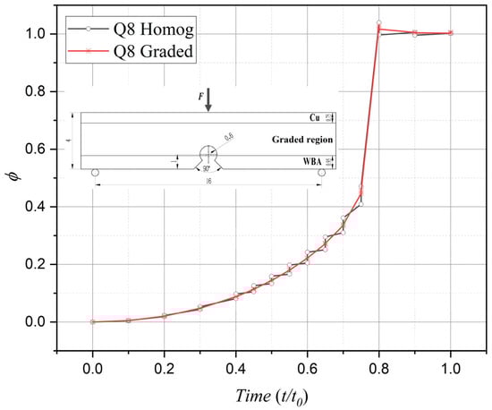 Similarly, in terms of phase-field damage evolution, computational results from both element types progressively converge toward the critical value of 1 with increasing load cycles, consistent with actual fracture processes. Nevertheless, comparative analysis reveals that the graded element formulation achieves significantly improved computational fidelity over its homogeneous counterpart, particularly during the critical 0.4–0.8 temporal progression phase.