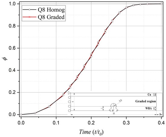 In light of the conclusion from the literature [24] on stress isoparametric elements—“Higher-order graded elements (e.g., quadratic and higher) are superior to conventional homogeneous elements based on the same shape functions” and “One should be careful when using graded elements with linear shape functions (e.g., Q4) as it may lose accuracy in certain situations such as uniform loading parallel to the material gradient direction”—the present study employs an 8-node phase-field isoparametric planar element (Q8 Graded) for comparative computations, in contrast to conventional homogeneous elements. The homogeneous element formulation adopted in this study is consistent with that described in [24]. The homogeneous element properties are defined by the material parameters at the element centroid, which are implemented through a user-defined material subroutine (UMAT) in ABAQUS.