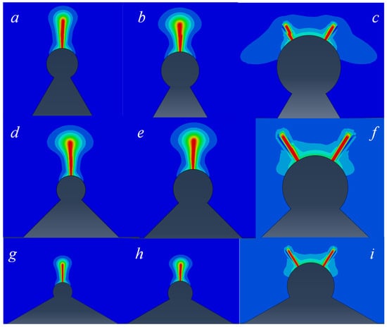 Crack propagation path calculated by phase field gradient element combined with Amor model. ((a) ρ = 0.3 mm 2α = 60°, (b) ρ = 0.4 mm 2α = 60°, (c) ρ = 0.6 mm 2α = 60°, (d) ρ = 0.3 mm 2α = 90°, (e) ρ = 0.4 mm 2α = 90°, (f) ρ = 0.6 mm 2α= 90°, (g) ρ = 0.3 mm 2α = 120°, (h) ρ = 0.4 mm 2α = 120°, (i) ρ = 0.6 mm 2α = 120°).