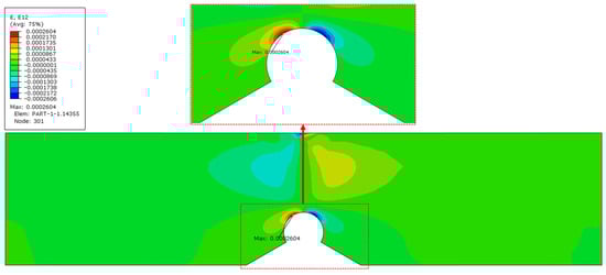 The reasons for this abnormal result are as follows. From the strain distribution in the undamaged state (Figure 11), it can be observed that the shear strain in this region is relatively high, which is the main component of the deviatoric strain. However, the equations of Amor model (21) show that, although the model does distinguish between positive and negative volumetric strain components, it neglects the distinction between deviatoric strain components. Coupled with the distribution characteristics of the tungsten-copper gradient alloy, which has a higher copper alloy content towards the top, resulting in a higher energy requirement for cracking, and this leads to the emergence of 45-degree evolution behavior.