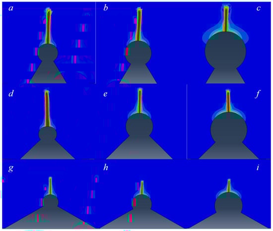 Crack propagation path calculated by phase field gradient element combined with Miehe model. ((a) ρ = 0.3 mm 2α = 60°, (b) ρ = 0.4 mm 2α = 60°, (c) ρ = 0.6 mm 2α = 60°, (d) ρ = 0.3 mm 2α = 90°, (e) ρ = 0.4 mm 2α = 90°, (f) ρ = 0.6 mm 2α = 90°, (g) ρ = 0.3 mm 2α = 120°, (h) ρ = 0.4 mm 2α = 120°, (i) ρ = 0.6 mm 2α = 120°).