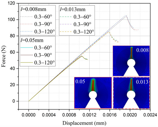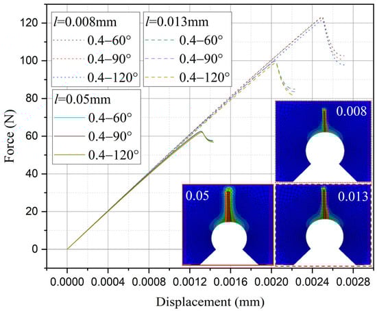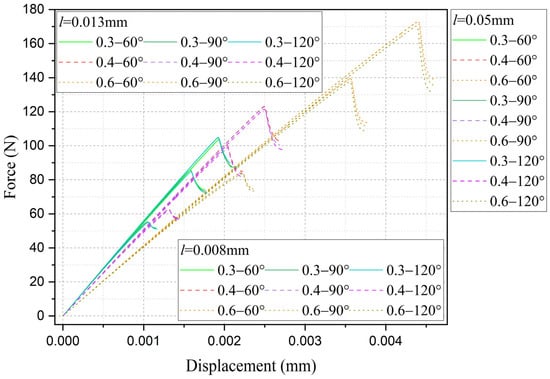 It can be observed that the loading force trajectory trends of the same notch geometry are consistent, and the residual strength (maximum load force value) gradually increases with the decrease of characteristic width. The maximum increase is close to 400 MPa, corresponding to a notch radius of 0.3 mm, when the characteristic width is reduced from 0.05 mm to 0.008 mm. And the crack path indeed appears thinner.