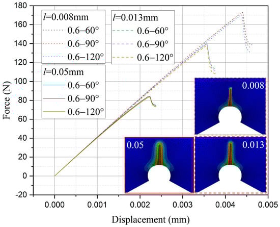 Furthermore, the influence of characteristic width on the residual strength of the notch tungsten-copper gradient functional materials is discussed. Three characteristic widths of 0.008 mm, 0.013 mm, and 0.05 mm are adopted to calculate the 9 notch shapes mentioned above, and the results are shown in Figure 13, Figure 14, Figure 15 and Figure 16.