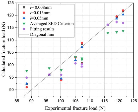where the calculated fracture load and experimental fracture load correspond to the numerical values shown in Figure 18.