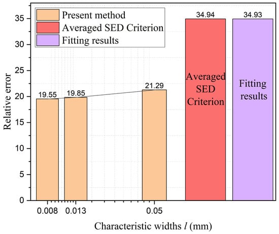 Comparison of relative error of the average strain energy criterion, fitting-based approach and the present method with 3 characteristic widths.