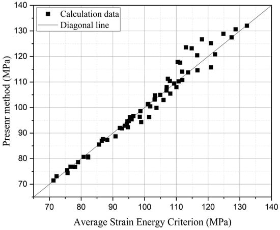 The calculation results, as depicted in the Figure 18, indicate that the average strain energy criterion yields an overall relative error of 34.94. In contrast, the model proposed in this paper exhibits an overall relative error ranging from 19.55 to 21.29. This represents a minimum improvement of approximately 39.07% to 44.05% (calculated as [(34.94 − 21.29)/34.94]100% and [(34.94 − 19.55)/34.94]100%, respectively) compared to the average strain energy criterion. This significant reduction in error underscores the effectiveness and superiority of the method introduced in this paper.