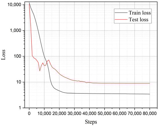 A comparative analysis of residual strength predictions between the present model and the average strain energy criterion is presented in Figure 20, while the training error evolution of the multi-fidelity neural network is illustrated in Figure 21. As shown in Figure 20, the residual strength results from both methods cluster near the diagonal, indicating that the MFNN optimization framework, which leverages a limited high-fidelity data alongside extensive phase field simulations, achieves predictions consistent with high-fidelity benchmarks across a broad parameter space. The MFNN training history in Figure 21 reveals final converged training and validation errors of 3.43 and 8.98, respectively. Comparative analysis with Figure 16 demonstrates a systematic reduction in training error as the volume of high-fidelity data increases, a trend that aligns with the inherent characteristics of multi-fidelity neural networks.