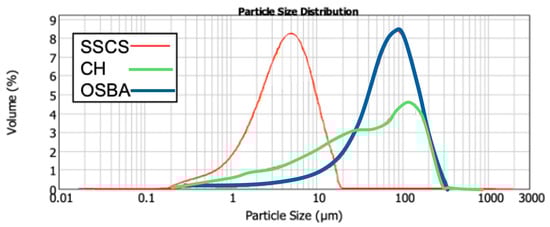 The physical characterization phase began with an analysis of the particle sizes of SSCS, CH, OSBA, and SGS to evaluate whether they were appropriate for ensuring the effective activation of the precursor materials during the geopolymerization process. A laser particle size distribution test was conducted in accordance with the UNE-EN 933-1:2012 standard [54] using a Malvern Mastersizer Bruker D8 Venture instrument (Malvern Instruments Ltd., Malvern, UK).